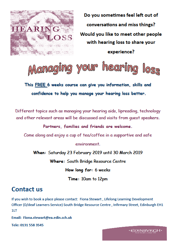 A new and free six-week managing your hearing loss course will take place in Edinburgh from Saturday 23rd February until 30th March 2019.